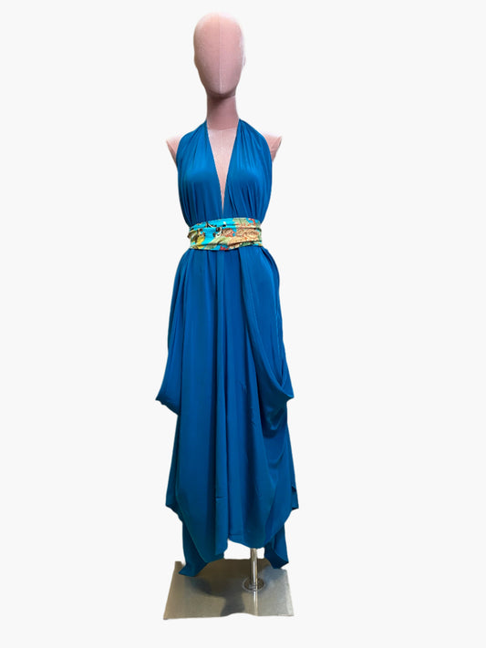 “Divine Drapery: The Silk Goddess Dress in Turquoise Blue